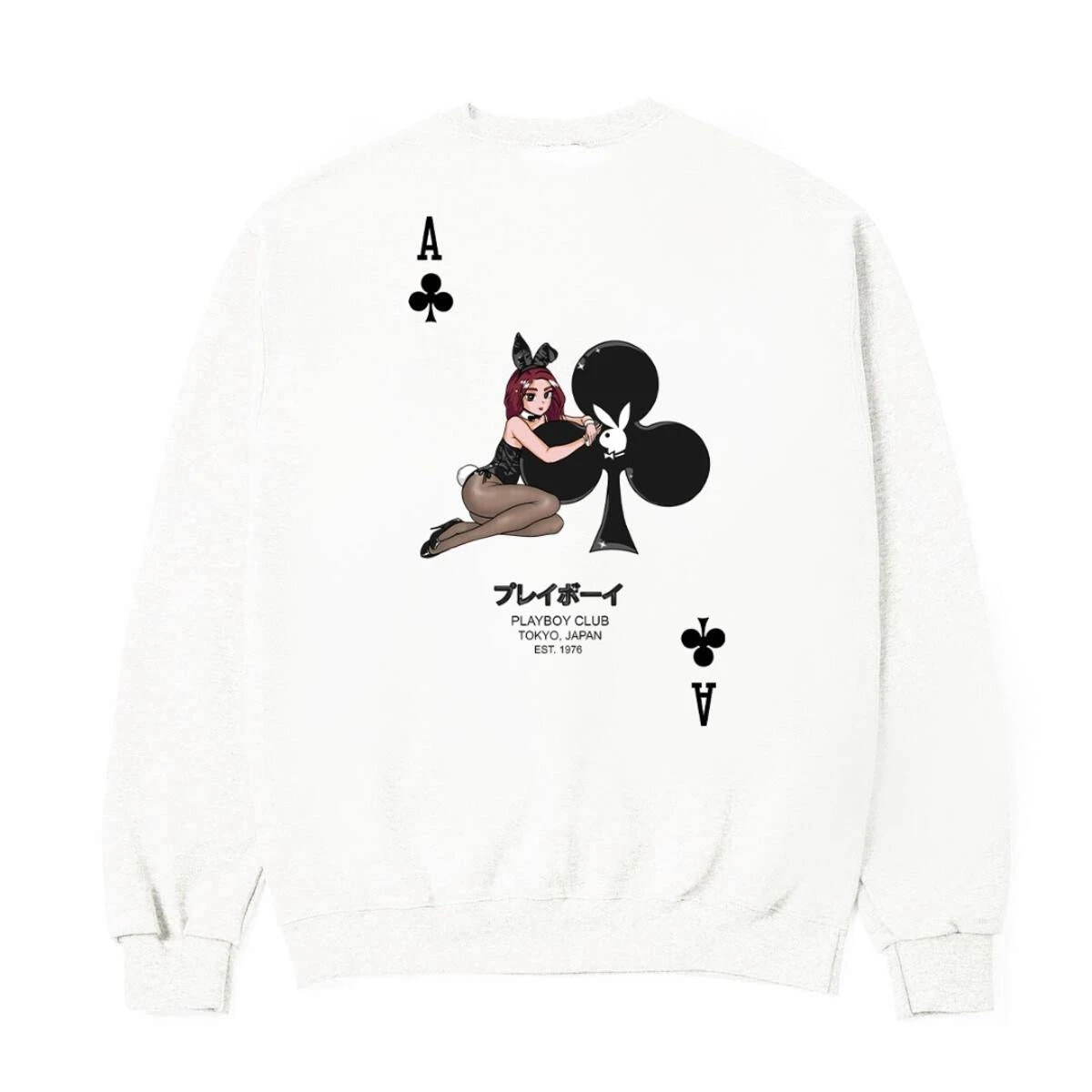 - Back Graphic: Featuring an anime-inspired Playboy Bunny beside a club suit, akin to a playing card, adding an element of mystique to the crewneck.