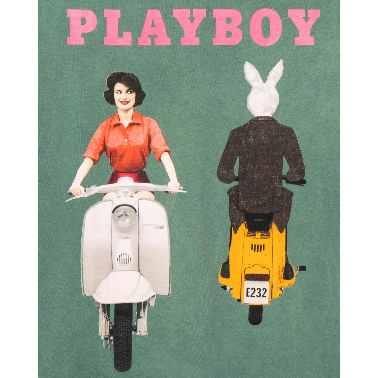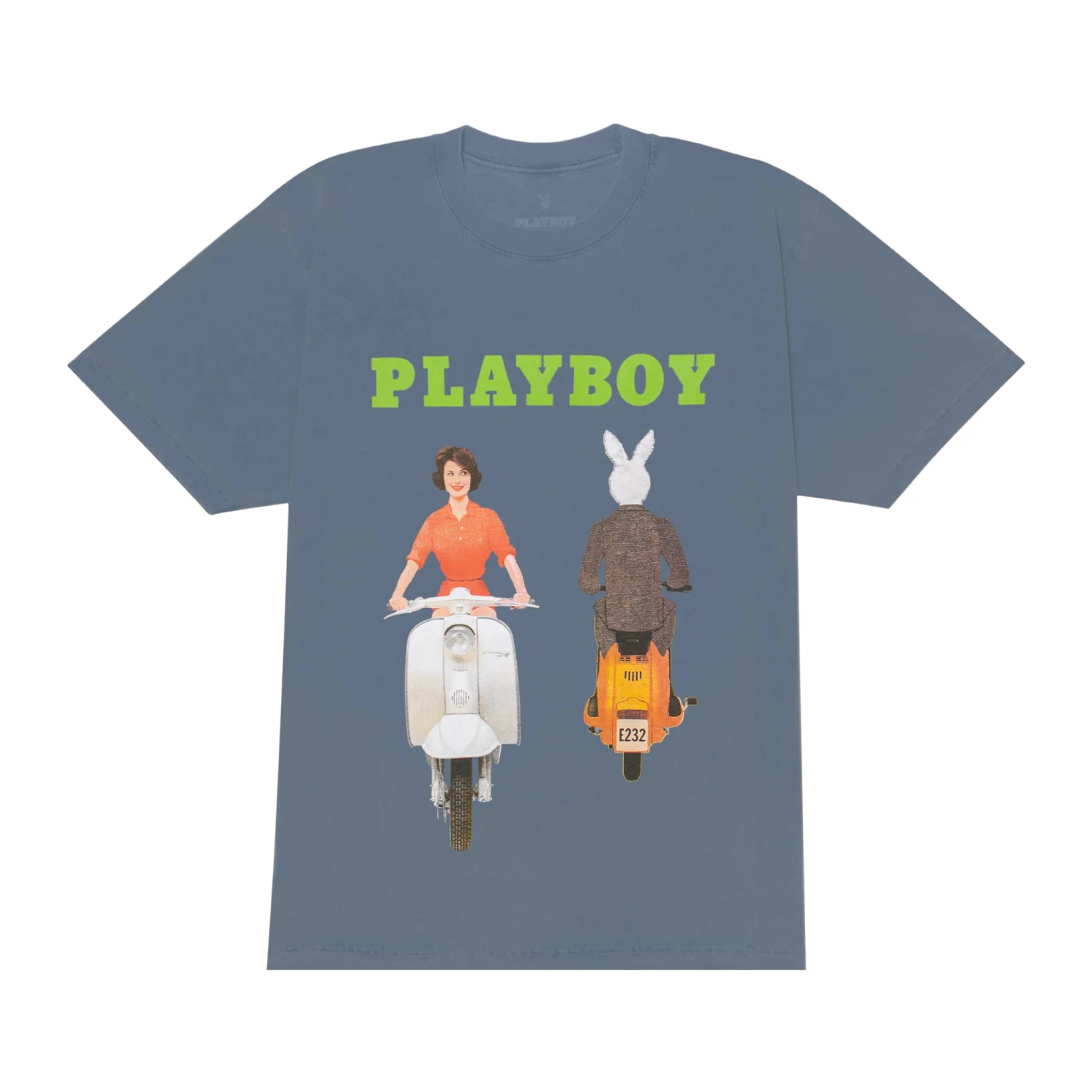 Wrap yourself in a slice of history with the June 1959 PLAYBOY Cover Tee. Not only does this shirt feature the whimsical art of Marilyn Hanold cruising past the iconic Playboy rabbit on a Vespa, but it also encapsulates the cultural zeitgeist of its time.