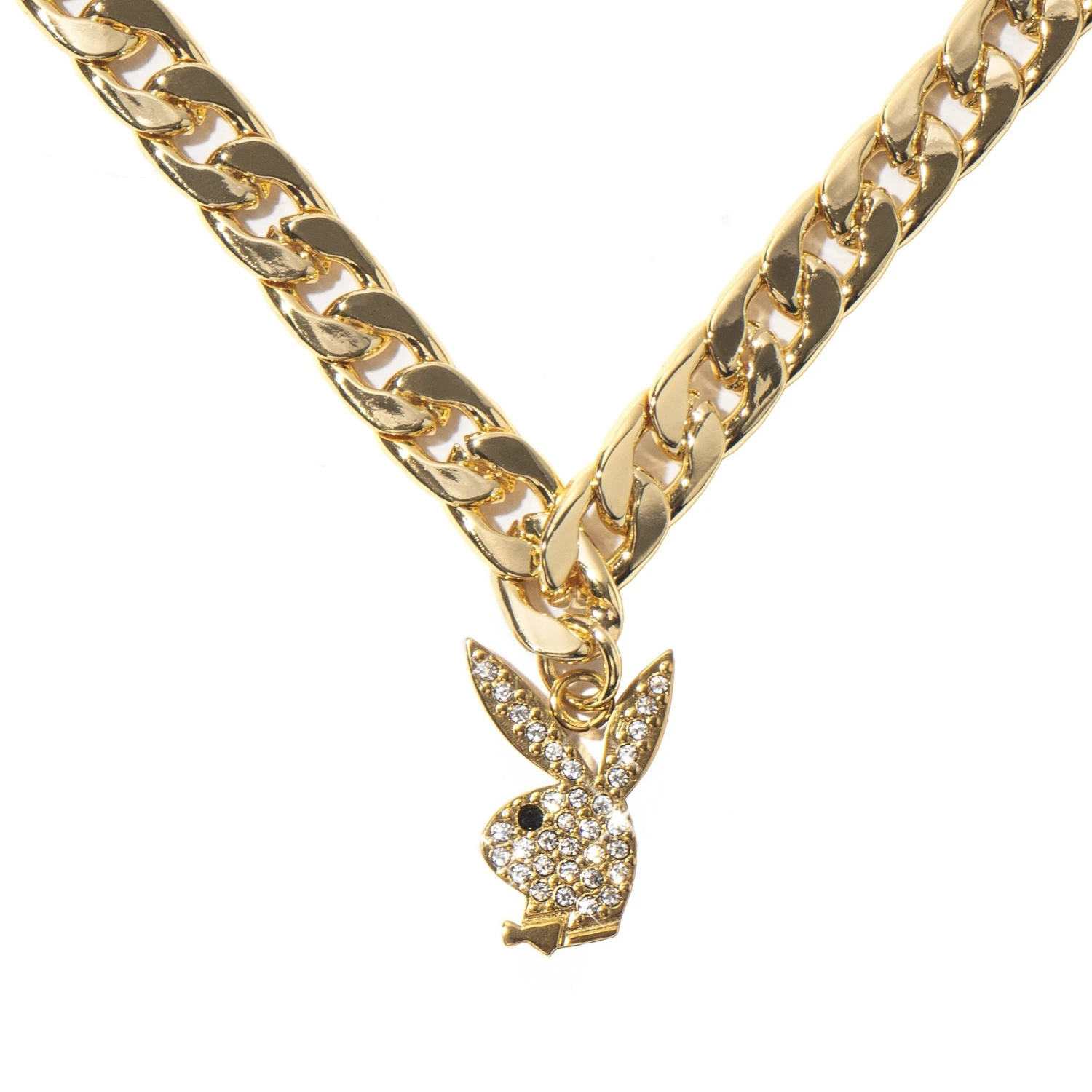 Introducing the Playboy Dalmata necklace. Worn by Travis Scott in the iconic Fall 2019 issue of Playboy featuring Kylie Jenner. This Playboy bunny necklace showcases the creative designs of jewelry designer Dalmata. Our stunning herringbone link chain connects to our crystal-studded Playboy Rabbit Head pendant.