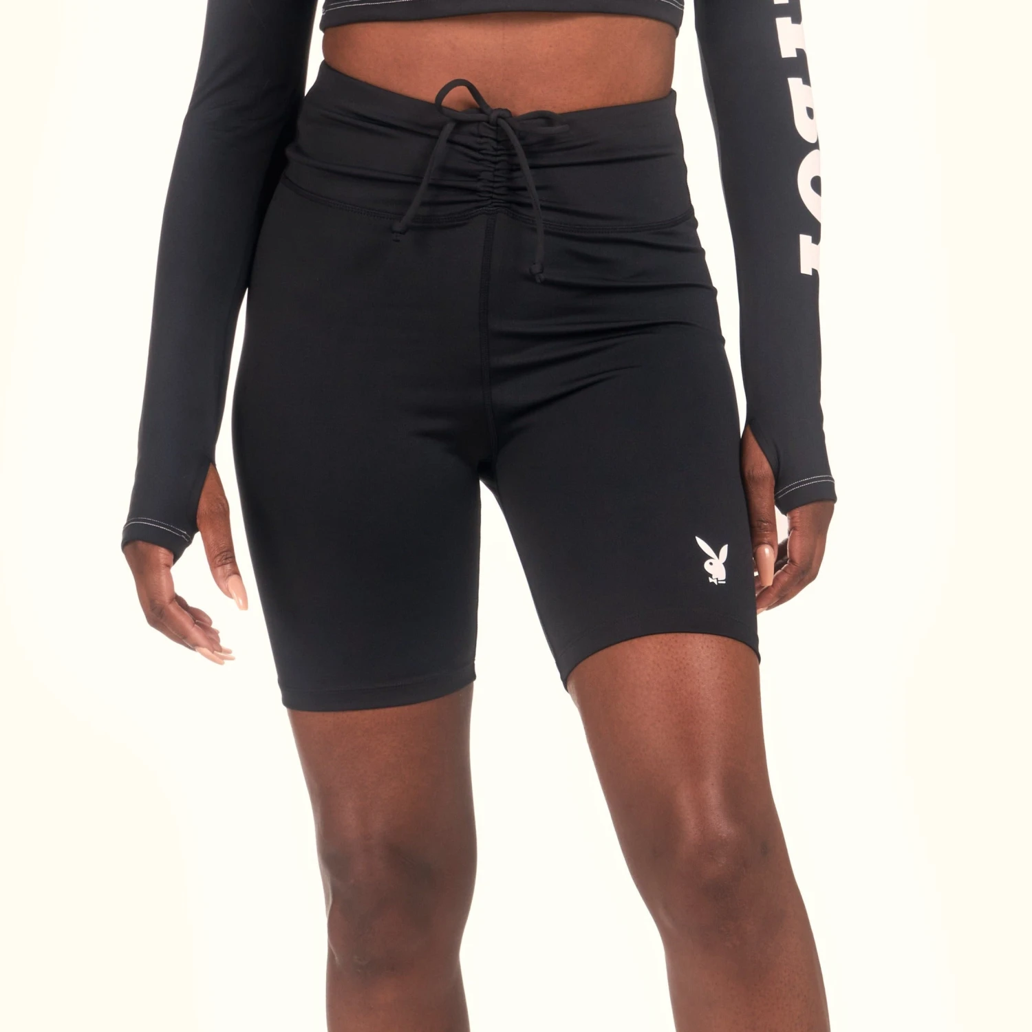Embrace the fusion of functionality and fashion with Playboy’s Women’s Active Tie Ruched Bike Shorts. These aren’t just any bike shorts; they’re a style revolution designed for the bold and the fearless.