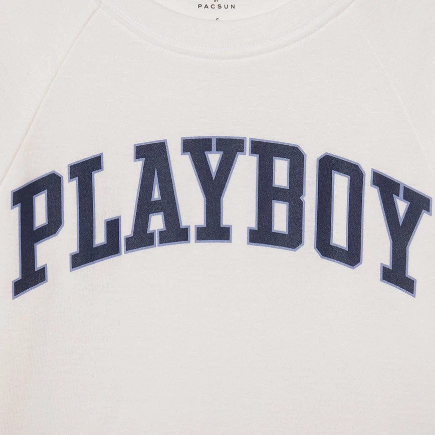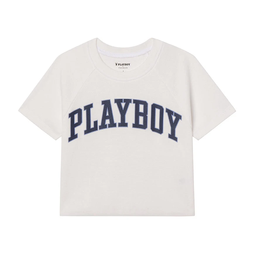 This cute and cropped baby tee features short sleeves, a crew neckline, a raw cut hem, and a Playboy graphic on the front.